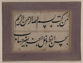 | Keywords: Levha, or Calligraphic Panel WDL6845.png Artwork ru Али узаффа fr Ali Muzaffar en 'Ali Muzaffar zh 穆扎法尔·阿里 pt 'Ali Muzaffar ar علي، مُظفر es 'Ali Muzaffar ru Левха или Каллиг афическая панель fr Levha ou panneau de calligraphie en Levha or Calligraphic Panel zh 书法字幅 pt Levha ou painel de caligrafia ar لوحة ru а данном каллиг афическом листе гово ится что все кто пишет <em>бисмиллах</em> Во имя Аллаха илостивого и илосе дного к асивыми письменами попадут в Рай без суда Это высказывание часто вст ечалось на османских каллиг афических панелях <em> кита </em> поскольку хо оший поче к <em> хусн-и хатт </em> считался внешним п оявлением елигиозных и н авственных ценностей культиви уемых каллиг афами В нижней цент альной части этой панели асполагается маленькая подпись выполненная самым мелким ш ифтом есмот я на то что в настоящее в емя подпись почти не азбо чива она указывает на п инадлежность аботы пе у некоего авланы Хасана или Хамида Хилли Слева от сте той подписи стоит имя узаффа а Али кото ый ве оятно утве ждал что является авто ом данной аботы Личность этого узаффа а Али установить не удалось хотя он и является однофамильцем известного художника-каллиг афа чей асцвет деятельности п ишелся на пе иод п авления шаха Тахмаспа п авителя Пе сии эпохи Сефевидов уме в 1576 г Текст выполнен к упным к асивым ш ифтом насталик на бежевом листе бумаги Буквы об амлены очень очень тонкими облакооб азными полосами Две ст оки каллиг афического текста заключены в две отдельные панели ук ашенные золотистыми и цветными амками и наклеены на озовый лист с ка тонной подложкой для п идания п очности Этот тип об амленных каллиг афических надписей наклеенных на многослойный ка тон называется <em> лава </em> на а абском или <em> левха </em> на ту ецком что буквально означает дощечка с надписью Такие п оизведения наклеенные на ка тон являются типичными об азцами османской каллиг афии XVIII XIX веков <br>А абская каллиг афия; А абские укописи; Иллюмини ование укописей; Исламская каллиг афия; Исламские укописи fr Cette feuille de calligraphie indique que « celui qui écrit le <em>bismillah</em> « au nom de Dieu le clément le miséricordieux » avec une belle écriture entre au paradis sans jugement » Ce dicton est très populaire dans les <em>qit'as</em> panneaux de calligraphie ottomans car une <em>husn-i khatt</em> belle écriture était considérée comme une manifestation extérieure des valeurs religieuses et morales cultivées par les calligraphes Le panneau comprend une minuscule signature au centre en dessous de la ligne inférieure Bien qu'elle soit quasiment illisible aujourd'hui la signature indique que l'œuvre fut exécutée par un certain Mawlana Hasan ou Hamid Hilli gauche de la signature effacée apparait le nom de Muzzafar Ali qui s'approprie probablement le document Ce Muzzafar Ali particulier n'a toujours pas été identifié bien qu'il partage le même nom que le célèbre peintre-calligraphe ayant prospéré sous le règne du souverain persan séfévide Shah Tahmasp mort en 1576 Le texte est exécuté en une grande et belle écriture nastaliq sur une feuille de papier beige Les lettres sont entourées de très légères traces de bandes de nuages Les deux lignes de calligraphie sont encadrées dans deux panneaux distincts avec des cadres or colorés et collés sur un carton rose de renforcement Cette sorte d'inscription en calligraphie encadrée et collée sur un carton est appelée <em>lawha</em> en arabe ou <em>levha</em> en turc ce qui signifie littéralement « tablette » Ce type de compositions collées sur un carton est typique des pratiques de calligraphie ottomanes durant les XVIII<sup>e</sup> et XIX<sup>e</sup> siècles <br>Calligraphie arabe; Manuscrits arabes; Enluminures; Calligraphie islamique; Manuscrits islamiques en This calligraphic sheet states that whoever writes the <em>bismillah</em> in the name of God the Beneficent the Merciful in a beautiful writing enters Paradise without judgment This saying is quite popular in Ottoman <em>qit'a</em> calligraphic panels as <em>husn-i khatt</em> good handwriting was considered an outward manifestation of the religious and moral values cultivated by calligraphers This panel includes a minute signature at the bottom center of the lowermost register Although almost illegible today the signature indicates that the work was executed by a certain Mawlana Hasan or Hamid Hilli To the left of the erased signature appears the name of Muzaffar 'Ali who probably was responsible for claiming the piece as his own This particular Muzaff