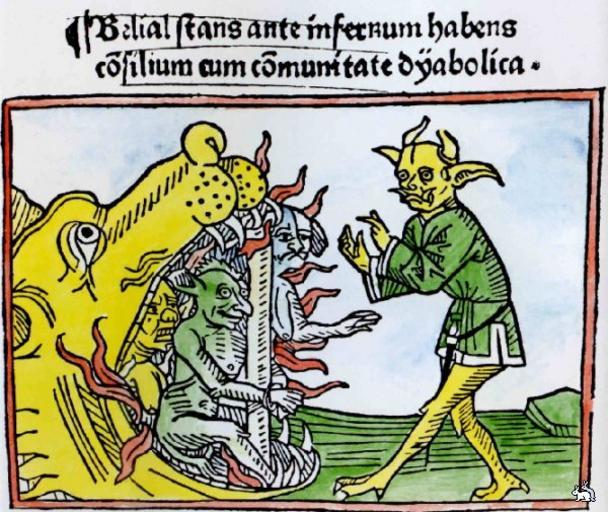 | Keywords: Leviathan1.jpg Г авю а на де еве иллюст и ующая сцену из книги «П оцесс Велиала» 1473 Якоба де Те амо а г авю е Велиал советуется со своими соб атьями у в ат ада п едставленных в виде пасти Левиафана // Woodcut illustrating a scene from the book The process of Belial 1473 Jacob de Teramo The engraving Belial consulted his brothers at the gates of Hell represented as the jaws of Leviathan http //copypast ru/2010/07/28/page 2 satana_i_ego_adskie_posobniki_chast_2 html 1473 Jacob de Teramo Leviathan Jaws in art PD-old-100 |