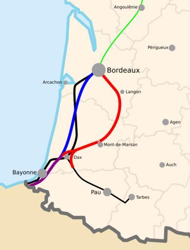 | Keywords: LGV Bordeaux - Frontière espagnole.svg Carte des trois options de la future LGV Bordeaux - Frontière espagnole En noir la ligne actuelle qui pourrait être portée de deux à quatre voies et l'embranchement vers Pau et Tarbes En rouge et en vert les deux options ligne nouvelle avec en violet leur tronc commun Départements_de_France svg http //www debatpublic-projetferroviaire-bordeaux-espagne org/documents/dossier-mo html 2009-10-21 19 51 UTC Départements_de_France svg bayo derivative work Benjism89 <span class signature-talk >talk</span> Départements de France auteur User bayo</nowiki> Uploaded with derivativeFX SVG maps of France High speed railway lines in France |