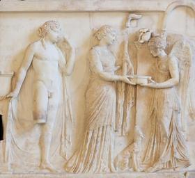 | Keywords: Libation Victory Louvre Ma484.jpg Victory pouring a libation to Apollo and Diana Marble relief 1st century BC restored in the middle of the 18th century the lower part only is antique La Victoire versant une libation à Apollon et Diane Bas-relief en marbre Ier century ap J -C restauré au milieu du XVIIIe siècle seule la partie inférieure est antique H 49 cm 19 ¼ in W 60 cm 23 ½ in D 5 cm 1 ¾ in Museum Louvre Department of Greek Etruscan and Roman antiquities Denon ground floor room A object history credit line Albani Collection; seized by French troops 1801 accession number Ma 484 MR 869 Jastrow 2006 other versions Victoire faisant une libation à Diane et Apollon musée du Louvre MR 869 |