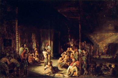 | Keywords: LIbby Prison by David Gilmour Blythe, 1863.jpg Artwork Creator David Gilmour Blythe Libby Prison 1863 Oil on canvas cm 61 28 91 76 Museum of Fine Arts Boston Boston USA From Museum of Fine Arts website Libby Prison in Richmond Virginia was one of the most notorious Confederate prisons in operation during the Civil War The building was originally a tobacco warehouse constructed by local merchant Fulton Libby in 1845; by 1862 it was a filthy vermin-infested dank prison housing as many as twelve hundred Union soldiers in six rooms each no more than forty by one hundred feet Many prisoners died there; those who survived suffered from poor health for the rest of their lives David Gilmour Blythe a self-trained artist with a satirist's eye and a keen dramatic sense never saw Libby Prison He spent the war years in Pittsburgh and relied on newspaper accounts and prints of the prison for information about the setting and the prisoners' wretched lives Some of his details are true to life-men play cards and checkers to pass the time others wash themselves at a water trough; a soldier at center comforts a feverish friend Other elements are broadly satirical-a man at center writes Time on a post while another reads Rip Van Winkle as though relief could be found in a story of twenty years' slumber ; the chaplain at center right offers sham solace to the despondent men Although many of his figures are crudely drawn Blythe's use of lighting is deftly theatrical and his rich red-and-brown color scheme intensifies the emotion of the scene Beneath the propagandistic accumulation of horrifying detail are echoes of several famous European paintings dealing with related themes which Blythe likely would have known through prints The similarities with William Hogarth's Bedlam the final scene in his epic series of paintings The Rake's Progress which were widely distributed in prints and Baron Gros' General Bonaparte Visiting the Plague-Stricken at Jaffa Musée du Louvre; a version is in the MFA suggest that the inhumanity of Libby Prison was not limited to the Civil War or America but was part of the larger age-old story of man's inhumanity to man This text was adapted from Davis et al MFA Highlights American Painting Boston 2003 available at www mfashop com/mfa-publications html http //www mfa org/collections/object/libby-prison-33168 Other versions http //www mfa org/collections/search_art asp recview true id 33168 PD-old-100 David Gilmour Blythe Prisoners of war in the American Civil War 1863 oil on canvas paintings in the United States Libby Prison 19th-century satirical art works Paintings of the American Civil War Draughts in art People playing draughts Prison interiors in art Military life Virginia in art |