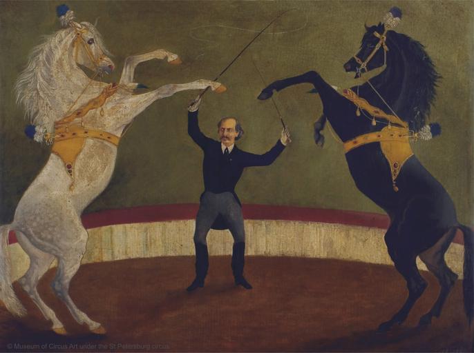 | Keywords: Liberty Act by Gaetano Ciniselli WDL11977.png Artwork ru а тиник Э fr Martinik E en Martinik E zh E·马丁尼克 pt Martinik E ar إي مارتينيك es Martinik E ru оме Гаэтано Чинизелли с лошадьми на свободе fr Numéro de chevaux en liberté par Gaetano Ciniselli en Liberty Act by Gaetano Ciniselli zh 加埃塔诺·奇尼塞利表演的自由马 节目 pt Performance com os cavalos soltos de Gaetano Ciniselli ar عرض الخيول الحرة لغايتانو تشينزيلي ru У оженец Италии Гаэтано Чинизелли 1815 1881 гг был ци ковым наездником и д есси овщиком лошадей основавшим в 1877 году ци к Чинизелли в настоящее в емя Большой санкт-пете бу гский госуда ственный ци к Ци к асполагался в пе вом в России каменном здании специально пост оенном для ци ка а этой ка тине Чинизелли изоб ажен исполняющим номе с лошадьми на свободе неизменно входивший в ци ковую п ог амму до его сме ти в 1881 году Вы ажение лошади на свободе используется п именительно к номе у в кото ом лошади уп авляются словесными командами без наездника и без поводьев то есть находясь на свободе Конюшни ци ка Чинизелли были ассчитаны на 100 лошадей и обо удованы специальным помещением для соде жания пони Авто ом данной ка тины созданной в 1877 году является Э а тиник о кото ом п актически ничего не известно <br>Чинизелли Гаэтано 1815 1881 гг ; Ци к; Ци к Чинизелли; Ци ковые а тисты; А тисты; Искусство ве ховой езды; Лошади fr Gaetano Ciniselli 1815 1881 écuyer et dresseur de chevaux italien fonda en 1877 le Cirque Ciniselli aujourd'hui le Cirque d'État Bolchoï de Saint-Pétersbourg Le cirque fut établi dans la première structure en pierre de Russie construite spécialement pour celui-ci Ce tableau représente Ciniselli alors qu'il effectue le numéro de chevaux en liberté qui demeura au programme du cirque jusqu'à sa mort en 1881 Le terme « en liberté » signifie que les chevaux sont dirigés à l'aide de commandes verbales Les chevaux sont dits « en liberté » car ils ne sont pas montés ou tenus par des rênes Les écuries du Cirque Ciniselli comptaient 100 stalles avec une partie spécialement dédiée aux poneys Le tableau datant de 1877 fut réalisé par E Martinik dont on sait peu de choses <br>Ciniselli Gaetano 1815-1881; Cirque; Cirque Ciniselli; Artistes de cirque; Artistes; Équitation; Chevaux en Italian-born Gaetano Ciniselli 1815 81 was a circus equestrian and horse trainer who in 1877 founded the Ciniselli Circus now the Bolshoi Saint Petersburg State Circus The circus was housed in the first stone structure in Russia purpose-built for circus In this painting Ciniselli is shown performing the liberty horse act which was an invariable part of the circus program until his death in 1881 The term liberty horse act refers to an act in which the horses are directed with verbal commands and are not mounted or held by reins; the horses are at liberty The Ciniselli Circus horse stables consisted of 100 stalls with a special area for keeping ponies The painting dating from 1877 is by E Martinik about whom little is known <br>Ciniselli Gaetano 1815-1881; Circus; Circus Ciniselli; Circus performers; Entertainers; Horsemanship; Horses zh 出生于意大利的加埃塔诺·奇尼塞利(Gaetano Ciniselli,1815 1881 年)是 位马戏团马 师和驯马师,他 1877 年创立了奇尼塞利马戏团(即现 的 彼得堡国家大马戏团) 该马戏团设于俄国第 座专为马戏团建 的石头建筑中 这幅画 描绘了奇尼塞利表演自由马 节目的情景, 他于 1881 年去世前,这是马戏团节目单中 持不变的节目 谓的 自由马 节目 是指表演节目的马匹听从口令指挥,无 骑 马背上或用缰绳控制,也就是说马匹处于 自由状 奇尼塞利马戏团的马厩由 100 个 栏组成,并 饲养小马的专门区域 这幅油画由 E·马丁尼克 E Martinik 1877 年创 ,关于此画家 知不详 <br>加埃塔诺·奇尼塞利,1815-1881 年; 马戏团; 奇尼塞利马戏团; 马戏团表演 ; 艺人; 马 ; 马 pt O italiano Gaetano Ciniselli 1815 a 1881 foi um cavaleiro de circo e treinador de cavalos que em 1877 fundou o Circo Ciniselli hoje o Circo Bolshói de São Petersburgo O circo era abrigado pela primeira estrutura de pedra na Rússia construída especialmente para um um circo Nesta pintura Ciniselli é mostrado realizando a performance com os cavalos soltos que foi uma parte invariável do programa do circo até sua morte em 1881 O termo performance com os cavalos soltos se refere a um ato em que os cavalos são conduzidos por comandos verbais e não estão montados ou amarrados com rédeas; os cavalos estão soltos Os estábulos do Circo Ciniselli consistiam em 100 tendas com uma área especial para os pôneis A pintura datada de 1877 é de E Martinik sobre quem pouco se sabe <br>Ciniselli Gaetano 1815 a 1881; Circo; Circo Ciniselli; Artistas de circo; Artistas; Equitação; Cavalos ar كان غايتانو تشينزيلي 1815 1881 مؤدياً لعروض الخيول ومدرباً للخيول أسس في عام 1877 سيرك تشينزيلي سيرك البولشوي الوطني بسانت بطرسبورغ حالياً كان مقر السيرك أولَ بناءٍ من الحجر بُن