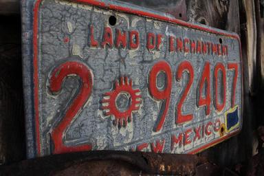 | Keywords: license plate new mexico antique land of enchantment new mexico license plate old license plate vintage license plate zia sign zia symbol antique license plate outdoor art yard art antique art antique car rusty rustic eclectic wooden fence art destination recycled art amber avalona |