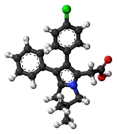| Keywords: Licofelone molecule ball.png Ball-and-stick model of the licofelone molecule a potential treatment for osteoarthritis Color code 505050 Carbon C black<br> F0F0F0 Hydrogen H white<br> F51E1E Oxygen O red<br> 3C50FA Nitrogen N blue<br> 14F014 Chlorine Cl green<br> 2011-08-02 own DS Visualizer Jynto talk Space-filling version cc-zero Images by Jynto Analgesics Azoles Monochlorobenzenes Carboxylic acids | ||||