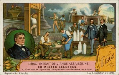 | Keywords: Liebig Company Trading Card Ad 01.12.005 front.tif Frédéric-Charles Achard Main image depicts the multiple steps in a manufacturing process going from bottom left to bottom right to top left; there is a circular inset of Archer on the left side Extensive text on verso Front LIBOX EXTRAIT DE VIANDE ASSAISONNÉ / CHIMISTES CELEBRES / 4 Fondation de la première fabrique de sucre de betterave par Achard / Reproduction interdite / Voir l'explication au verso LIBOX SEASONED BEEF EXTRACT FAMOUS CHEMISTS 4 Establishment of the first beet sugar factory by Achard Reproduction prohibited See explanation on reverse Verso Chez nous chaque diner est un festin / depuis que nous cuisinons avec Libox l'Extrait de Viande assai- / sonné de la Cie Liebig Il donne une saveur exquise à tous les mets / et répand une odeur appétissante Une petit dose suffit pour / rehausser le gout de chaque plat Il y a une difference surprenante / entre les mets prepares avec Libox et ceux dépourvus / de ce condiment précieux Fondation de la première fabrique de sucre de betterave par Achard / Le chimiste Marggraf 1709-1782 fut le premier à découvrir qu'on pouvait retirer / du sucre non seulement de la canne exotique mais également de certaines plantes / européennes telles que la betterave Son élève Frédéric-Charles Achard 1753-1821 / sut donner une application pratique à cette découverte en créant à Cunern avec / l'assistance du Rio une fabrique de sucre de betterave Cet événement fut le point / de depart du développement de l'industrie sucrière en Europe où le sucre était très / rare et cher auparavant With us every diner is a feast since we cook with Libox Extract of Meat Co seasoning It gives a great taste every dish and spreads an appetizing smell A small dose is sufficient to enhance the taste of each dish There is a surprising difference between the dishes prepared with Libox and those without this precious condiment Founding of the first beet sugar factory by Achard The chemist Marggraf 1709-1782 was the first to discover that one could remove the sugar cane not only from exotic plants but also from some European plants such as beets His pupil Frederick Charles Achard 1753-1821 knew how to give a practical application of this discovery by creating Cunern with the assistance of the King a beet sugar factory This event was the starting point for the development of sugar industry in Europe where sugar was very scarce and expensive date 1929 ink paper in 4 375 2 750 Institution Chemical Heritage Foundation object history exhibition history credit line http //www chemheritage org/ Chemical Heritage Foundation Image downloaded with permission from the Chemical Heritage Foundation as part of the Wikipedian in Residence initiative CHF-cooperation anonymous-EU accession number 01 12 005 Collectible cards of Liebig's Extract of Meat Company 1880 Images from the Chemical Heritage Foundation |