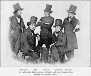 | Keywords: Liebig Lab Anf1843.jpg Privatassistenten bei Liebig in Gießen Carl Remigius Fresenius 28 Dezember 1818 in Frankfurt am Main; 11 Juni 1897 in Wiesbaden Heinrich Will 8 Dezember 1812 in Weinheim; 15 Dezember 1890 in Gießen John Lloyd Bullock 1814 4 Juni 1905 http //www ncbi nlm nih gov/pmc/articles/PMC2320819/ page 1http //books google de/books id e4G7AAAAIAAJ pg PA51 lpg PA51 dq john+gardner+Pharmacologist source bl ots 0x4frvZ3WY sig sGGK9W4Nn5RDYgHiuQObNHZesJ0 hl de sa X ei GoQeVKK1KsmkPeyYgOgM ved 0CEwQ6AEwBg v onepage q john 20gardner 20Pharmacologist f false John Gardner 1804 1880 http //books google de/books id e4G7AAAAIAAJ pg PA51 lpg PA51 dq john+gardner+Pharmacologist source bl ots 0x4frvZ3WY sig sGGK9W4Nn5RDYgHiuQObNHZesJ0 hl de sa X ei GoQeVKK1KsmkPeyYgOgM ved 0CEwQ6AEwBg v onepage q john 20gardner 20Pharmacologist f false August Wilhelm von Hofmann 8 April 1818 in Gießen; 5 Mai 1892 in Berlin http //sceti library upenn edu/sceti/smith/scientist cfm PictureID 2139 ScientistID 1342 CFID 10283916 CFTOKEN 14242042 1843 author PD-old ImageNote 1 1709 2165 262 56 2858 2383 2 John Gardner ImageNoteEnd 1 ImageNote 2 1359 2161 203 52 2858 2383 2 John Lloyd Bullock ImageNoteEnd 2 ImageNote 3 962 965 44 44 2858 2383 2 Heinrich Will ImageNoteEnd 3 Carl Remigius Fresenius 1843 Heinrich Will chemist 1843 John Lloyd Bullock 1843 John Gardner 1843 August Wilhelm von Hofmann 1843 Group portraits with 5 persons Men with top hats 1840s Top hats in black and white photographs 1840s fashion |