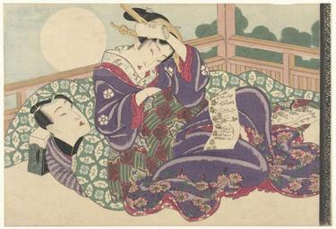 | Keywords: Liefdespaar bij volle maan-Rijksmuseum RP-P-2008-239.jpeg accession number RP-P-2008-239 Anonymous credit line GWToolset Rijksmuseum nl Man en vrouw onder dekens liggend op veranda bij volle maan De vrouw in haar linker hand een rol tissues houdend reikt met haar rechter hand onder de dekens; over haar paarse kimono ligt een gekalligrafeerde tekst Label Line attributed to Keisai Eisen 1790 - 1848 na 1800 - in of voor 1848 kleurenhoutsnede; lijnblok in zwart met kleurblokken Collection prenten; Japan collectie beeld Height mm 262 beeld Width mm 383 exhibition history Institution Rijksmuseum paper object history Acquisition 2008 object type prent PD-US PD-old Data and photography rights All data and all images made available through the API are either in the public domain or are subject to a CC0 license https //www rijksmuseum nl/en/api/terms-and-conditions-of-use cc-zero place of creation Japan http //www rijksmuseum nl/collectie/RP-P-2008-239 http //hdl handle net/10934/RM0001 COLLECT 460402 handle Liefdespaar bij volle maan Uploaded with GWToolset Rijksmuseum RP-P-2008-239 http //www rijksmuseum nl/media/assets/RP-P-2008-239 Images uploaded by Fæ Images from the Rijksmuseum Japanese 19th-century prints in the Rijksmuseum Amsterdam |
