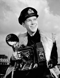 Keywords: Lieutenant John D. Mahoney of the Royal Canadian Navy Volunteer Reserve, holding an Anniversary Speed Graphic camera, 1944. urcameras Ur Cameras