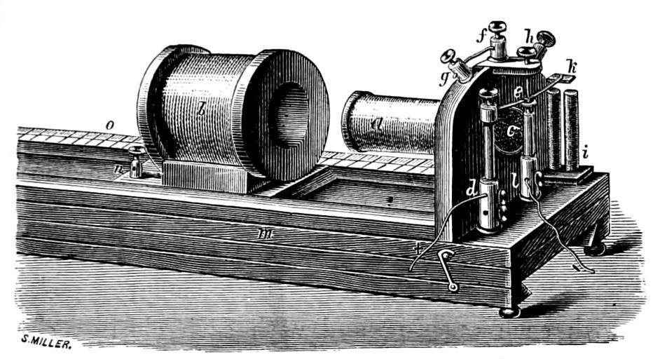 | Keywords: Life in Motion Fig 19.png en Fig 19 ”Induction coil of du Bois Reymond a primary coil; b secondary coil; c bunch of wires in centre of primary coil for increasing intensity of induction currents; d binding screw for attachment of wire from galvanic element The current passes up the pillar d along steel spring to e thence to the screw the point of which touches the back of the spring at e; from f through wire of primary coil to i round the two pillars of soft iron i which it renders magnetic and thus draws down the head of the spring k; this interrupts the current at e thus breaking the contact of the spring at the screw point When the current is thus interrupted the spring flies up by its elasticity and again establishes the circuit at e This interruption was originally invented by P Wagner Life in Motion or Muscle and Nervehttps //archive org/details/b21929786 John Gray McKendrick 1892 1926 Life in Motion book Electric switches |