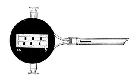 | Keywords: Life in Motion Fig 57.png en Fig 57 ”Small thermal pile Observe the junctions of bismuth and antimony The distance from a to b is one-fourth of an inch Life in Motion or Muscle and Nervehttps //archive org/details/b21929786 John Gray McKendrick 1892 1926 Life in Motion book Thermoelectricity |