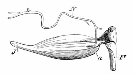 | Keywords: Life in Motion Fig 07.png en Fig 7 ”The gastrocnemius muscle of a frog prepared for experiment F femur bone of the leg; N sciatic nerve ending in muscle at n; J tendon of Achilles with a small hole in it for a hook Life in Motion or Muscle and Nervehttps //archive org/details/b21929786 John Gray McKendrick 1892 1926 Life in Motion book Anura muscles |