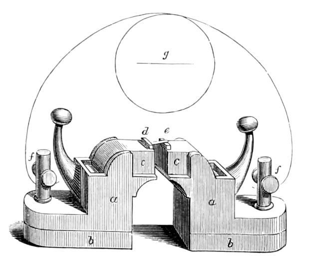 Keywords: Life in Motion Fig 69.png en Fig 69 ”Arrangement of du Bois Reymond's troughs a a troughs of zinc; b vulcanite plates for insulation; c c paper pads; d e clay pads; f f connections for wires leading to galvanometer g Life in Motion or Muscle and Nervehttps //archive org/details/b21929786 John Gray McKendrick 1892 1926 Life in Motion book Biology experiments |