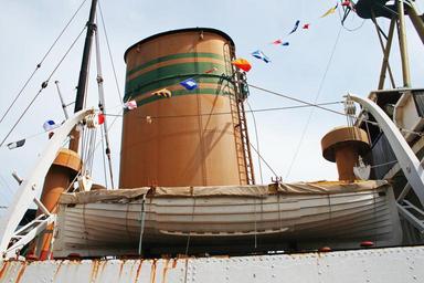 Keywords: lifeboat on tug boat boat tug old retired stack lifeboat white wood on deck