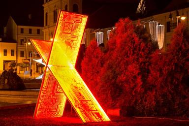Keywords: light expo light art night buildings banská bystrica city dark orange slovakia design
