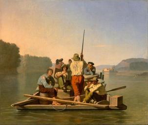 | Keywords: Lighter Relieving a Steamboat Aground by George Caleb Bingham, 1847.jpg Artwork Creator George Caleb Bingham Lighter Releiving a Steamboat Aground 1847 oil on canvas cm 77 91 9 White House Washington D C United States Notes from Kloss William et al Art in the White House A Nation's Pride Washington D C The White House Historical Association 2008 <br> Instead of painting 'the never-ending transit of steamers' that was the reality of the 1840s Bingham has wrapped his picture in the dream of the past embodied in his monumental group of idle boatmen raptly listening to stories The scene is unhurried locked in place by geometry--a pyramid of strikingly foreshortened interlocked figures carefully aligned with the picture plane The steamboat in the distance has run aground on the shoal The primary focus is on the self-sufficient boatmen Having removed cargo from the steamer 'lightened' it so it can float free from the shoal they have turned from it to listen to their storyteller The White House Historical Association PD-art Other versions http //www whitehouseresearch org/assetbank-whha/action/viewAsset id 45 <gallery> File George Caleb Bingham Lighter Relieving the Steamboat Aground jpg </gallery> PD-old-100 DEFAULTSORT George Caleb Bingham Lighter Relieving the Steamboat Aground Lighter Relieving a Steamboat Aground by George Caleb Bingham |