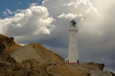 Keywords: lighthouse beacon warning shore light navigation tower landmark landscape seascape clouds rocks coastline coast nautical maritime safety scenic guidance beam danger signal architecture building new zealand