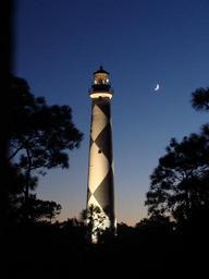 Keywords: lighthouse ocean night darkness moon sea light trees reflection coast warning navigation beacon landscape seascape coastline tower building architecture scenic house symbol shore illuminated