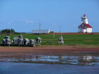 Keywords: lighthouse old fishing huts shoreline beach prince edward island canada