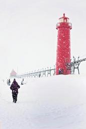 Keywords: lighthouse red michigan people winter walking snow ice cold