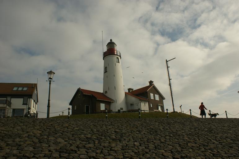 Keywords: lighthouse silhouette woman dog heaven clouds secretive light person dark netherlands houses dyke