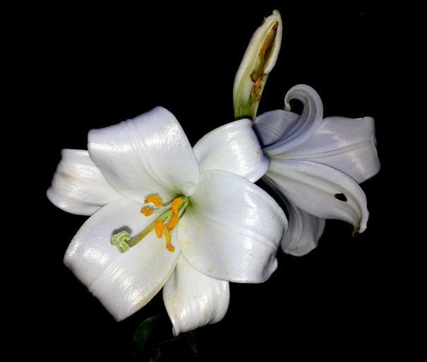 Keywords: lily flower white petal white flower purity plant garden bloom dark background pistilli