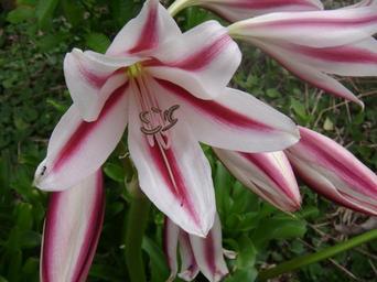 Keywords: lily flowers lilies pink white stripes petals purple green leaves green background floral blossoms blooms blooming decorative ornamental fleurs flowering plants gardens gardening bright