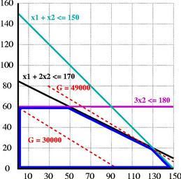 | Keywords: Linear programming polytope.png Linear Programming polytope self-made using xfig and fig2dev 2007-03-04 Sdo own work The area surrounded by the blue line is the feasible region of the linear programming problem <math> \min \ 300 x_1 + 500 x_2 \; \; x_1 + 2 x_2 \leq 170 \; x_1 + x_2 \leq 150; \; x_1 x_2 \geq 0 \ </math> The red lines are potential lines of the objective functions i e all points on such a red lines have the same objective value The optimal value is 49000 and it is attained at the unique optimal solution 130 20 The fig source file is available from me upon request Polytopes Optimization |