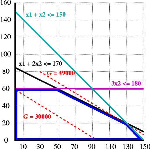 | Keywords: Linear programming polytope.png  Linear Programming polytope self-made using xfig and fig2dev 2007-03-04 Sdo own work The area surrounded by the blue line is the feasible region of the linear programming problem <math> \min \ 300 x_1 + 500 x_2 \; \; x_1 + 2 x_2 \leq 170 \; x_1 + x_2 \leq 150; \; x_1 x_2 \geq 0 \ </math> The red lines are potential lines of the objective functions i e all points on such a red lines have the same objective value The optimal value is 49000 and it is attained at the unique optimal solution 130 20 The fig source file is available from me upon request Polytopes Optimization  |