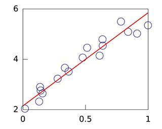 | Keywords: Linear-regression.svg en An example of linear regression Own Qef 2009-06-21 Designed to replace original bitmap version en File Linear-regression png Qef Gnuplot source Created with the following Gnuplot file <pre> set terminal svg font Bitstream Vera Sans 24 set output Linear-regression svg set xrange 0 1 set yrange 2 6 set xzeroaxis linetype -1 set yzeroaxis linetype -1 set xtics border nomirror 0 5 set ytics border nomirror 2 set key off set border 15 set samples 2 duh straight line plot '-' with points pointtype 6 pointsize 1 5 linecolor 6 0 84018771715471 5 0920721752254 0 78309922375861 5 4993770054934 0 91164735793678 5 0219594480046 0 33522275571489 3 663139781769 0 27777471080319 3 2292176040979 0 47739705186216 4 0677809238643 0 36478447279184 3 5137723092023 0 95222972517471 6 3816035819077 0 6357117279599 4 7956233221396 0 1416025553558 2 7597376235082 0 01630057162433 2 0398219692681 0 13723157678602 2 9002851883054 0 15667908925408 2 6485946288034 0 12979044678146 2 3215484331961 0 99892451800356 5 3518979261186 0 5129323944044 4 4596524827421 0 61263983259566 4 1465031113153 0 63755226770302 4 5417962600388 e plot 3 7 x+2 15 with lines linewidth 3 linecolor 1 </pre> The actual data is just randomly choosen points along the line randomly displaced from it created with a small Lua program <pre> function f x return 3 7 x + 2 15 end for _ 1 18 do local x math random print x f x 0 85 + 0 3 math random end </pre> Linear regression Images with Gnuplot source code |
