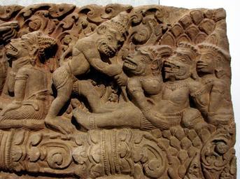 | Keywords: Linteau Ramayana Musée Guimet 9973.jpg Linteau représentant un épisode du Ramayana ici la mort de Valin Cambodge province de Battambang Vat Baset style du Baphuon 11ème siècle Grès Musée Guimet Paris Own 2007-09-30 Vassil Art of Cambodia in the Musée Guimet Sculptures from Cambodia Vat Baset Death of Vali |