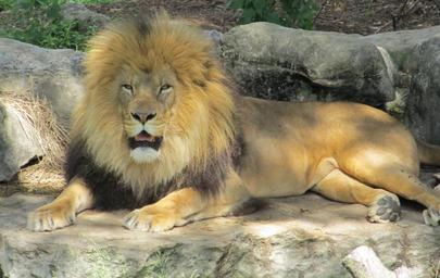Keywords: lion feline big cat king of the jungle male predator wildlife nature leo zoo enclosure resting fur looking mammal carnivore portrait hunter majestic creature rocks shadows