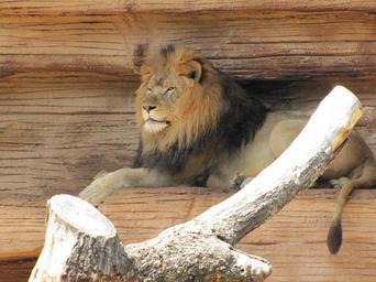 Keywords: lions zoo animals mammals male furry resting hairy relaxing alone wildlife wooden background woods king jungle forest predators leader dangerous bright sunlight sunny day