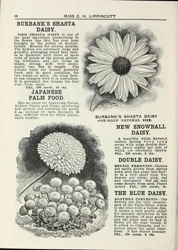 | Keywords: Lippincott seeds (15750741904).jpg 28 <br> MISS C H LIPPINCOTT <br> BURBANK'S SHASTA <br> DAISY <br> THIS SHA8TA DAISY is one of <br> the most marvelous productions in <br> the flower line that has ever been <br> brought to the notice of floricul- <br> turists Blooms for several months <br> The flowers are extremely large and <br> graceful averaging about four inch- <br> es in diameter with three or more <br> rows of petals of the purest glisten- <br> ing whiteness and are borne on <br> single strong stlfif wiry stems <br> nearly two feet in length The <br> blooms when cut remain perfectly <br> fresh and in good condition for <br> two weeks or more No other flow- <br> er can compare with it in usefulness <br> It is perennial but blooms the first <br> year from seeds <br> rkt 100 seeds 10 cts <br> JAPANESE <br> PALM FOOD <br> Has no equal for improving Palms <br> Rubber Plants and Ferns producing <br> new growth and renewing the green <br> 6 oz package by mail postpaid 25 <br> cts-; sufficient food for thirty plants <br> three months <br> BURBANK'S SHASTA DAISY <br> ONE-HALF NATURAL SIZE <br> NEW SNOWBALL <br> DAISY <br> A beautiful white flowered <br> variety having very long <br> stems with large double flow- <br> ers about eighty per cent of <br> which are extremely double <br> Pkt 300 seeds 6 cts <br> DOUBLE DAISY <br> BELLIS PERENNia ” Daisies <br> are easily grown from spring <br> sown seed and come 5nto flow- <br> er in a very short time The <br> flowers are white pink red <br> and variegated Not all will <br> come double from seed Finest <br> mixed Pkt 300 seeds 5c <br> THE BLUE DAISY <br> AGATHEA COELESTIS- The <br> flowers are the very counter- <br> art of the Paris Daisy which <br> s sky blue with a yellow disc <br> It makes a very pretty object <br> for summer decoration in the <br> flower garden ; of easy growth <br> and the plant may be had in <br> flower all tho year 'round It <br> Is allied to Cineraria and n- <br> quir» s about the same treat- <br> ment A fine winter bloomer <br> Pkt 200 seeds 4 cts <br> m fs 42162027 132824 65968 Page 28 Text http //www biodiversitylibrary org/page/42162027 1915 Henry G Gilbert Nursery and Seed Trade Catalog Collection ; Miss C H Lippincott Firm NameFound Agathea coelestis NameConfirmed Agathaea coelestis Cass EOLID 6269608 NameFound Bellis NameConfirmed Bellis L EOLID 59430 NameFound CINERARIA NameConfirmed Cineraria EOLID 6258313 NameBankID 1674869 NameFound CINERARIA NameConfirmed Cineraria EOLID 6258313 NameBankID 4894724 Biodiversity Heritage Library Lippincott seeds 1915 Garden Stories Catalogs Flowers Fruit Nurseries Horticulture Seeds Vegetables U S Department of Agriculture National Agricultural Library bhl page 42162027 dc identifier http //biodiversitylibrary org/page/42162027 bhlGardenStories BHLinbloom nurseries horticulture u s department of agriculture national agricultural library bhlgardenstories bhlinbloom Information field Flickr posted date ISOdate 2015-01-26 Check categories 2015 August 25 CC-BY-2 0 BioDivLibrary https //flickr com/photos/61021753 N02/15750741904 2015-08-25 05 54 29 cc-by-2 0 PD-old-70-1923 Lippincott seeds Photos uploaded from Flickr by Fæ using a script |