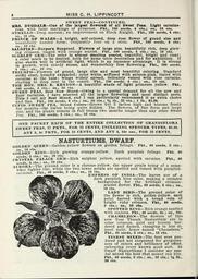 | Keywords: Lippincott seeds (15753157203).jpg MISS C H LIPPINCOTT <br> SWEET TEAS CONTINUED <br> MBS DUGDALiB One of the largest flowered of all Sweet Peas Light carmine- <br> rose with faint markings of primrose Pkt 100 seeds 4 cts ; oz 10 cts <br> OTHELLO Deep maroon; an improvement on Black Knight Pkt 100 seeds 4 cts; <br> oz 10 cts <br> PBINCB OF WALES A bright self-colored deep rose flower of grand size and <br> beautifully hooded form; frequently four on a stem Pkt 100 seeds 4 cts; <br> oz 10 cts <br> SALOPIAN Burpee's Sunproof Flowers of large size beautifully rich deep glow- <br> ing crimson tinged with orange scarlet Pkt 100 seeds 4 cts ; oz 10 cts <br> SCARLET GEM The color is almost dazzlinsr scarlet beautiful bright and clear; <br> a color much to be desired both for home table decoration and for exhibition It <br> also shows well in artificial light which is an immense advantage It is strong <br> in growth with sturdy stems and wonderfully free flowering Pkt 100 seeds <br> 4 cts ; oz 10 cts <br> TKIUMPJI Flowers of grand large size and most beautiful coloring Standard <br> stiffly erect broadly expanded; color white suffused with salmon-pink tinted with <br> carmine at the base; wings widely spread delicately veined with rose carmine <br> shading to deep rose in the center Pkt 100 seeds 4 cts ; oz 10 cts <br> THE HON J rRS E KENYON A beautiful shade of light primrose yellow Pkt <br> 100 seeds 4 cts ; oz 10 cts <br> SWEET I'EAS Best New Mixed Owing to a special demand for all the new and <br> finer varieties I have selected all the larger flowering and most distinct sorts <br> This I call my Best Mixed and I can particularly recommend it as extra choice <br> and fine Pkt 100 seeds 4 cts ; oz 10 cts ; lb 25 cts ; 1 lb 1 00 <br> CUPID SWEET PEA Mixed Colors Jrows but 5 inches high and blooms freely <br> for months the leaves being quite hidden The flowers of fine form and large <br> size and the plants remain in full bloom two months longer than any other Sweet <br> I'ea I'kt 100 seeds 4 cts ; oz 10 cts <br> ONE PACKET EACH OF THE ENTIRE COLLECTION OF GRANDIFLORA <br> SWEET PEAS 27 PKTS FOR 75 CENTS INCLUDING SPENCER TYPES 1 30 <br> ANY 3 4c PKTS FOR 10 CENTS AND ANY 4 10c ozs FOR 25 CENTS <br> carmine <br> NASTURTIUMS DWARF <br> GOLDEN QUEEN Golden-yellow flowers on golden foliage Pkt 40 seeds 5 cts ; <br> GOLDEN KING Rich glowing orange-yellow Dark purplish foliage Pkt 40 <br> tweeds 5 cts ; oz 10 cts <br> CRYSTAL PALACE GEM Rich sulphur yellow spotted with carmine Pkt 40 <br> seeds 5 cts ; oz 10 cts <br> AURORA The ground color is a chrome-yellow the upper petals being of a some- <br> what lighter tint while the two lower petals are spotted and veined with purplish- <br> Pkt 40 seeds 5 cts ; oz 10 cts <br> EMPRESS OF INDIA The leaves are of a <br> dark purplish blue color making a suitable <br> background for the brilliant crimson- <br> scarlet flower Pkt 40 seeds 5 cts ; oz <br> 10 cts <br> LADY BIRD The ground color of <br> the flower Is rich golden-yellow each <br> petal barred with a broad vein of <br> bright ruby crimson Pkt 40 seeds <br> 5 cts ; oz 10 cts <br> SPOTTED KING Rich orange spotted <br> with maroon Pkt 40 seeds 6c ; oz 10c <br> CHA3IELEON The flowers of this <br> new Tom Thumb Nasturtium are in <br> color crimson gold and bronze bor- <br> dered and flamed changing in hue al- <br> most daily hence named Chameleon <br> Pkt 40 seeds 6 cts ; oz 16 cts <br> FINEST MIXED The best ever pro- <br> iuced and not surpassed for gorgeous- <br> Qess of colors and brilliancy of effect <br> embracing every known good sort In <br> Dwarf Nasturtiums I consider my spe- <br> cial mixed the best that money can buy <br> Pkt 40 seeds 5 cts ; oz 10 cts ; V lb <br> 30 cts 42162047 132824 65968 Page 8 Text http //www biodiversitylibrary org/page/42162047 1915 Henry G Gilbert Nursery and Seed Trade Catalog Collection ; Miss C H Lippincott Firm Biodiversity Heritage Library Lippincott seeds 1915 Garden Stories Catalogs Flowers Fruit Nurseries Horticulture Seeds Vegetables U S Department of Agriculture National Agricultural Library bhl page 42162047 dc identifier http //biodiversitylibrary org/page/42162047 bhlGardenStories BHLinbloom nurseries horticulture u s department of agriculture national agricultural library bhlgardenstories bhlinbloom Information field Flickr posted date ISOdate 2015-01-26 Check categories 2015 August 25 CC-BY-2 0 BioDivLibrary https //flickr com/photos/61021753 N02/15753157203 2015-08-25 05 55 50 cc-by-2 0 PD-old-70-1923 Lippincott seeds Photos uploaded from Flickr by FĂŚ using a script |