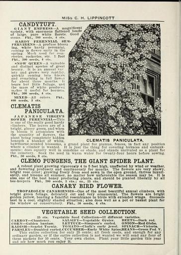 | Keywords: Lippincott seeds (15753179533).jpg MISJj C H LIPPINCOTT <br> CANDYTUFT <br> GIANT EMPRESS A magnificent <br> variety with enormous flattened heads <br> of large pure white florets Good <br> stems Pkt 200 see ls 4 cts <br> HARDY PERENNIAL SEM <br> I'ERVIRENS A profuse bloom <br> Ing white hardy perennial <br> coining in flower early in the <br> spring Miu'h used for ceui- <br> eteries rockeries etc 1 foot <br> Pkt 200 seeds 4 cts <br> SNOW QUEEN A valuable <br> and distinct species of great <br> beauty It is ar-i annual var <br> lety and grows very rapi liv <br> quickly coming into blooin <br> and remaining in full tlo tt <br> for about three months li <br> bears but little foliage and <br> the mass of white produrf <br> m ikes it useful for borrleis <br> Pkt 300 seeds 4 ets <br> MIXED All colors Pkt <br> 400 seeds 3 cts <br> CLEMATIS <br> PANICULATA <br> JAPANESE VIRGIN'S <br> BOWER PERENNIAL This <br> is one of the really good hardy <br> r-limbers The leaves are of a <br> bright glossy green and when <br> in bloom it astonishes with <br> the quantity of flowers the <br> plant being completely hidden _ _ _ r ÂŤ ii/ iii a-i-a <br> beneath a blanket of white CLEMATIS PANICULATA <br> hawthorne-scented blossoms a grand plant for piazzas fences in fact any position <br> where a climber is wanted It is just the thing for covering terraces and embank- <br> ments; does equally well in sunshine or shade and stands unrivaled as a plant for <br> the cemetery Soak the seed in warm water for twenty-four hours before sowing <br> Pkt 50 seeds 8 cts <br> CLEMO PUNGENS THE GIANT SPIDER PLANT <br> A robust plant growing vlgorouely 4 to 5 feet high unaffected by wind or weather <br> and flowering profusely and continuously for months The flowers are very showy <br> bright rose color; growing freely from seed sown in the open ground thrives luxuri- <br> antly and blooms all summer no matter how unfavorable the season may be It is <br> also one of the best honey producing plants and should be planted liberally by all <br> bee-keepers Pkt 200 seeds 3 cts ; oz 25 cts <br> CANARY BIRD FLOWER <br> TROPAEOLUM CANARIENSIS One of the most beautiful annual climbers with <br> bright green foliage delicately cut and very ornamental The flowers are bright <br> golden yellow bearing a fanciful resemblance to birds with extended wings Succeeds <br> best in a cool slightly shaded situation; also does well as a pot or basket plant for <br> the window or conservatory Pkt 30 seeds 4 cts <br> VEGETABLE SEED COLLECTION <br> 25 cts Vegetable Seed Collection 12 different varieties <br> CARROT Chanteney SALSIFY Vegetable Oyster BEETS Dark red <br> CORN Golden bantam LETTUCE Simpson's curled ONION Bed Globe <br> RADISH Scarlet Turnip TO MATO Chalk's early jewel SPINACH Victoria <br> PARSLEY Doubled curled CUCUMBER Early White SpineJ3EANS Green Pod V <br> This entire collection for only 25 cents ; all fresh seeds and enough for any <br> ordinary garden or if the entire collection is not wanted we will send any four of <br> these packets for 10 cents Your own choice Plant your little garden this year <br> nnd see how much you enjoy It 42162033 132824 65968 Page 22 Text http //www biodiversitylibrary org/page/42162033 1915 Henry G Gilbert Nursery and Seed Trade Catalog Collection ; Miss C H Lippincott Firm NameFound Clematis paniculata NameConfirmed Clematis paniculata EOLID 11205608 NameBankID 2778766 NameFound Tropaeolum canariensis NameConfirmed Tropaeolum canariense Lindley Moore Biodiversity Heritage Library Lippincott seeds 1915 Garden Stories Catalogs Flowers Fruit Nurseries Horticulture Seeds Vegetables U S Department of Agriculture National Agricultural Library bhl page 42162033 dc identifier http //biodiversitylibrary org/page/42162033 bhlGardenStories BHLinbloom nurseries horticulture u s department of agriculture national agricultural library bhlgardenstories bhlinbloom Information field Flickr posted date ISOdate 2015-01-26 Check categories 2015 August 25 CC-BY-2 0 BioDivLibrary https //flickr com/photos/61021753 N02/15753179533 2015-08-25 05 52 17 cc-by-2 0 PD-old-70-1923 Lippincott seeds Photos uploaded from Flickr by FĂŚ using a script |