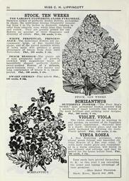| Keywords: Lippincott seeds (16187206049).jpg 34 <br> MISS C H LIPPINCOTT <br> STOCK TEN WEEKS <br> THE LARGEST FLOWERING GLOBE PYRAMIDAL <br> Immense spikes of perfectly double flowers pyramidal <br> in shape the individual blooms frequently measur- <br> ing from 2 to 2 2 inches in diameter ranging in <br> color from crimson rose white blue lilac brown ˘- <br> and yellow They are greatly prized for cut 5 <br> flowers on account of their fragxance and j - <br> diversity of colors Pkt 100 seeds 5 cts - <br> WHITE PERPETUAL PRINCESS <br> ALICE ” The individual flowers are un <br> commonly large of fine rosette like <br> shape and of the purest possible white <br> If sown early will produce u great <br> abundance of bloom from June until <br> November Pkt 100 seeds 5 cts <br> PEACH BLOSSOM ” The plants are <br> of neat pyramidal habit of growth <br> crowded with magnificent heads of <br> beautifully shaped perfectly double <br> sweet-scented flowers of a delicate <br> peach-blossom color For beauty and \ <br> long continuance of bloom it is unsur- <br> passed Pkt 100 seeds 5 cts <br> DWARF GERJWAN ” Fine mix <br> 100 seeds 6 cts <br> Pkt <br> STOCK TEN WEEKS <br> SCHIZANTHUS <br> BUTTERFLY FLOWER ” The Poor Man's <br> Orchid neat pyramidal bushes covered with <br> a multitude of small butterfly-like flowers of <br> the most brilliant and striking color designs <br> Pkt 500 seeds 5 cts <br> VIOLET VIOLA <br> The violet should not be wanting in <br> ny garden on account of its fragrance <br> and early appearance Succeeds best <br> n a shady sheltered place and can be <br> easily increased by dividing the roots <br> Finest mixed Pkt 150 seeds 5 cts <br> VINCA ROSEA <br> A free flowering perennial with <br> glossy green foliage and beautiful cir- <br> cular flowers of a fine rose color If <br> sown early under glass and transplant- <br> ed in a warm situation will bloom in <br> the summer and autumn and may be <br> potted for the house before frost Pkt <br> 100 seeds 5 cts <br> SCHIZANTHUS <br> Your seeds have proved thoiKselves <br> O K so this year I am enlarging <br> the order and taking advantage of <br> your premium <br> ”Miss Mabel Thornton <br> Shaw Kans March 3rd 1915 42205442 132981 65968 Page 34 Text http //www biodiversitylibrary org/page/42205442 1915 Henry G Gilbert Nursery and Seed Trade Catalog Collection ; Miss C H Lippincott Firm NameFound Orchid NameFound Schizanthus NameConfirmed Schizanthus aff pinnatus Reeves 24 EOLID 11884489 NameFound Vinca rosea NameConfirmed Vinca rosea EOLID 581125 NameBankID 2775716 Biodiversity Heritage Library Lippincott seeds 1916 Garden Stories Catalogs Flowers Fruit Nurseries Horticulture Seeds Vegetables U S Department of Agriculture National Agricultural Library bhl page 42205442 dc identifier http //biodiversitylibrary org/page/42205442 bhlGardenStories BHLinbloom nurseries horticulture u s department of agriculture national agricultural library bhlgardenstories bhlinbloom Information field Flickr posted date ISOdate 2015-01-26 Check categories 2015 August 25 CC-BY-2 0 BioDivLibrary https //flickr com/photos/61021753 N02/16187206049 2015-08-25 05 56 47 cc-by-2 0 PD-old-70-1923 Lippincott seeds Photos uploaded from Flickr by Fæ using a script |