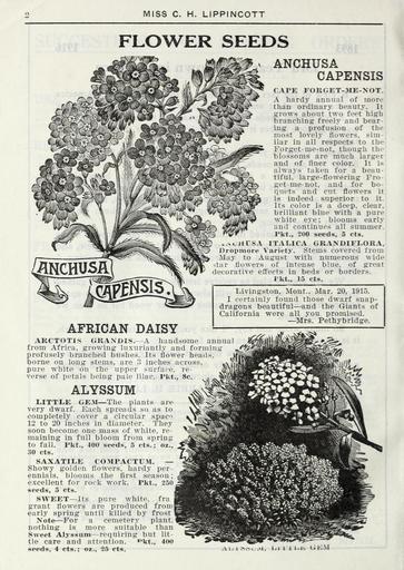 | Keywords: Lippincott seeds (16372476002).jpg MISS C H LIPPINCOTT <br> FLOWER SEEDS <br> ANCHUSA <br> CAPENSIS <br> CAPE FORGET-ME-NOT <br> A hardy annual of more <br> than ordinarj- beauty It <br> grows about two feet high <br> branching freely and bear- <br> ing a profusion of the <br> most lovely flowers sim- <br> ilar in all respects to the <br> Forget-me-not though the <br> blossoms are much larger <br> and of liner color It is <br> always taken for a beau- <br> tiful large-flowering Fro- <br> get-me-not and for bo- <br> quets and cut flowers it <br> is indeed superior to it <br> Its color is a deep clear <br> brilliant blue with a pure <br> white eye; blooms early <br> and continues all summer <br> Pkt 200 seeds 5 cts <br> - crirSA ITALICA GKANDIFLOKA <br> Dropmore Variety Stems covered from <br> May to August with numerous wide <br> tar flowers of intense blue of great <br> decorative effects in beds or borders <br> Pkt 15 cts <br> AFRICAN DAISY <br> Livingston Mont Mar 20 1915 <br> I certainly found those dwarf snap- <br> dragons beautiful and the Giants of <br> California were all you promised <br> Mrs Pethybridge <br> AKCTOTIS GRANDIS A handsome annual <br> from Africa growing luxuriantly and forming <br> profusely branched bushes Its flower head <br> borne on long stems are 3 inches across <br> pure white on the upper surface re- <br> verse of petals being pale lilac Pkt 8c <br> ALYSSUM <br> I ITTIiE GEM The plants are <br> very dwarf Each spreads so as to <br> completely cover a circular spac' <br> 12 to 20 inches in diameter They <br> soon become one mass of white re- <br> maining in full bloom from spring <br> to fall Pkt 400 seeds 5 cts ; oz <br> 30 cts <br> SAXATILE COMPACTUM <br> Showy golden flowers hardy per- <br> ennials bloom s the first season ; <br> excellent for rock work Pkt 250 <br> seeds 5 cts <br> SWEET Its pure white fra <br> grant flowers are produced from <br> early spring until killed by frost <br> Note For a cemetery plant <br> nothing is more suitable than <br> Sweet Alyssum requiring but lit- <br> tle care and attention ข'kt 40 ยป <br> seeds 4 cts ; oz 25 cts <br> i 1 i-r i;km 42205410 132981 65968 Page 2 Text http //www biodiversitylibrary org/page/42205410 1915 Henry G Gilbert Nursery and Seed Trade Catalog Collection ; Miss C H Lippincott Firm NameFound Alyssum NameConfirmed Alyssum L EOLID 39058 NameFound Anchusa capensis NameConfirmed Anchusa capensis EOLID 596328 NameBankID 2663402 NameFound Compactum NameConfirmed Compactum NameBankID 4455517 Biodiversity Heritage Library Lippincott seeds 1916 Garden Stories Catalogs Flowers Fruit Nurseries Horticulture Seeds Vegetables U S Department of Agriculture National Agricultural Library bhl page 42205410 dc identifier http //biodiversitylibrary org/page/42205410 bhlGardenStories BHLinbloom nurseries horticulture u s department of agriculture national agricultural library bhlgardenstories bhlinbloom Information field Flickr posted date ISOdate 2015-01-26 Check categories 2015 August 25 CC-BY-2 0 BioDivLibrary https //flickr com/photos/61021753 N02/16372476002 2015-08-25 05 55 15 cc-by-2 0 PD-old-70-1923 Lippincott seeds Photos uploaded from Flickr by Fรฆ using a script |