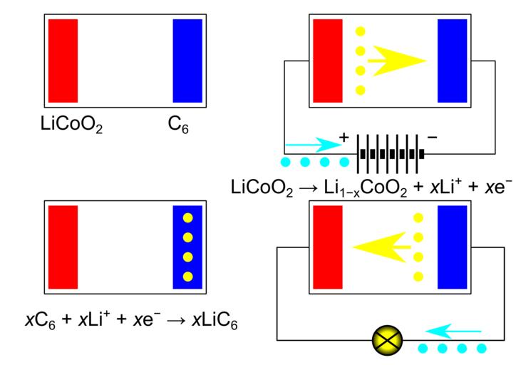 | Keywords: Lithium cobaltate vs graphite lithium-ion battery scheme.png en A scheme of lithium-ion battery with lithium cobaltate and graphite as electrode materials Top left uncharged state Top right charging process a de-intercalation half-reaction is given Bottom left a charged state with lithium ions intercalated into graphite an intercalation half-reaction is given Bottom right discharge process ru Схема аботы литий-ионного аккумулято а с элект одами из кобальтата лития и г афита Вве ху слева аз яженное состояние Вве ху сп ава п оцесс за яда п иведена полу еакция деинте каляции Внизу слева за яженное состояние ионы лития инте кали ованы в г афит п иведена полу еакция инте каляции Внизу сп ава п оцесс аз яда 2016-02-07 own Sergey WereWolf other versions cc-zero Electric battery schemas Lithium batteries Created with Inkscape |
