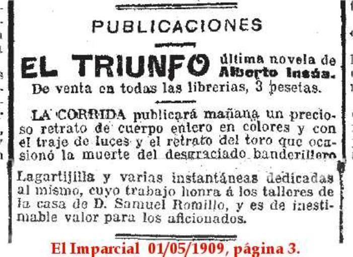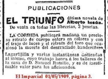 | Keywords: Litografia-Samuel-Romillo-1909-Lagartijilla.jpg it Annuncio della prossima pubblicazione su la Corrida del ritratto intero del famoso torero Lagartijilla ossia Rafael Molina Sánchez 1841-1900 e del toro che ne causò la morte El Imparcial Madrid 1 5 1909 pagina 3 Litografia Samuel Romillo 1 5 1909 PD-old 1909 advertisements in Spain Samuel Romillo El Imparcial advertisements 1909 | ||||