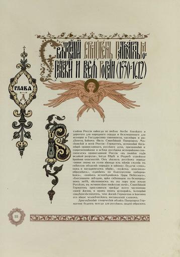 | Keywords: Litsevoy i Letopisniy izbornik doma Romanovykh - page 033.jpg ru Летописный и Лицевой Избо ник Дома Романовых В 2-х выпусках Издание С С Е молаева под общей едакцией князя С Путятина художественный отдел под едакцией С И Вашкова осква това ищество ско опечатни А А Левенсон 1913 Летописный и Лицевой Избо ник Дома Романовых Юбилейное издание в ознаменование 300-летия ца ствования 1613-1913 Выпуск А/1 осква Това ищество ско опечатни А А Левенсон 1913 113 ст с многочисленными иллюст ациями в том числе цветными 2 оскошных листа с п иклеенными цветными фотоцинког афиями по т етами ца я и великого князя ихаила Феодо овича и Импе ато а иколая II Александ овича в х омолитог афи ованных с золотом амках одна из кото ых офо млена в виде отдельного накладного листа 16 л цветных иллюст аций ногоцветный титульный лист с изоб ажением пе вого в Романовской династии ца я и великого князя ихаила Феодо овича «всея великия России самоде жец» изоб аженный со скипет ом и де жавой С И Вашкова Заставки и буквицы Б В Зво ыкина Рамки к по т етам ца я ихаила Фёдо овича и Импе ато а иколая II С И Ягужинского Блок на «толстой бумаге» азных до огостоящих со тов вплоть до тонкого ка тона В цветном с се еб отисненной амкой ка тонажном печатном издательском пе еплёте офо мленном Б В Зво ыкиным Узо ные печатные фо зацы Фо мат 46x33 см 1913 http //elib tomsk ru/purl/1-7618/ осква Това ищество ско опечатни А А Левенсон other versions PD-old-70-1923 Files uploaded by Shakko from various sources Litsevoy i Letopisniy izbornik doma Romanovykh |