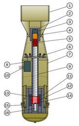 | Keywords: Little Boy internal diagram.svg right 150px thumb Without the labels Rough diagram depicting what are thought to be some of the major internal parts of the Little Boy nuclear weapon This version has its components labeled For a version without the labels see Image Little Boy internal diagram no labels svg Caption Box tail fins Steel gun breech assembly Detonator Cordite conventional explosives Uranium-235 projectile six rings 26 kg in a thin can of steel Baro sensing ports and manifold Bomb casing wall Arming and fusing equipment Gun barrel steel around 10 cm diameter 200 cm length Arming wires Tamper assembly steel Uranium-235 target two rings 38 kg Tamper/reflector assembly tungsten carbide Neutron initiator Archie fuzing radar antennas Recess for the boron safety plug not shown to be ejected into Source Drawing is by User Fastfission Weapon information is from http //nuclearweaponarchive org/Nwfaq/Nfaq8 html Nuclear Weapons Archive FAQ and from Chuck Hansen U S Nuclear Weapons The Secret History 1988 Not drawn to scale some of the components are heavily simplfied Created with Inkscape Fastfission If you want to credit someone credit Wikimedia Commons Otherwise don't credit anyone that's fine by me --Fastfission 14 57 14 April 2008 UTC Cross sections of nuclear weapons Little Boy Diagrams labelled with numbers only 2003 diagrams |