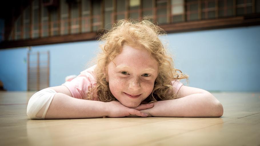 Keywords: little girl gymnast hall happy laying on the floor red hair