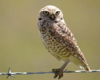 Keywords: little owl perched wire portrait predator staring wildlife nature bird eyes fence raptor