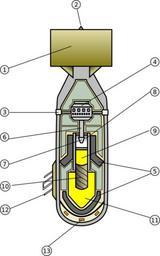 | Keywords: Littleboy inner1 info.png 49 Little Boy internal diagram svg Little Boy - atomic bomb Hiroshima - schematic view of the inside with labels I didn't put text in this schema to ease translation to other wikis Stabilizing Fins Tail cone Air inlet tubes Air pressure detonator Lead Shield container Detonator arm Detonating head Conventional Explosive Charge cordite Uranium-235 Bullet ca 24 kg 16 cm long 10 cm diameter gun cylinder not drawn to proportion it was 180 cm long with an inner diameter of 10 cm Uranium-235 Target ca 36 kg with receptacle neutron reflector is just above Archie radar altimeter antenna 4xAPS-13 Fuses inserted to arm bomb just before dropping it Schema der Atombbombe von Hiroshima Little Boy Stabilisierungsflossen Heckkegel Lufteinlassröhren Luftdruckzünder Bleiabschirmung Zünderanschluß Zündkopf Konventionelle Sprengladung Kordit U-235 Kugel Schußkanal U-235 Ziel mit Aussparung neutronenreflektor genau darüber Fernüberwachungssonden Zünder wurden kurz vor Abwurf eingebaut um die Bombe scharf zu schalten Done with Inkscape 0 41 from the few info available on the web the original blueprint would have been useful This is not supposed to be accurate but it gives a rough idea of the main parts of the gun-type model thumb 100px Version without labels thumb 100px Actual device Assessments 2 Picture of the day 2005 09 0 9 Cross sections of nuclear weapons Little Boy 2003 diagrams |