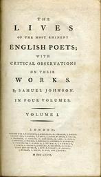 | Keywords: LivesEnglishPoetsTP1781.jpg Title page of a 1781 edition of Samuel Johnson's Lives of the Poets Private Collection of S Whitehead 1781 Samuel Johnson C Bathurst Public Domain PD-old-100 Samuel Johnson Scientific books book covers single pages etc 1781 books Title pages from England |