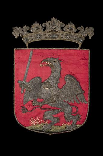 Keywords: Livlands vapen med grip, 1660 - Livrustkammaren - 108736.tif LSH artwork sv Vapensköld av röd sidenatlas kantad av en bård av en snodd av smala silverlan och gul silkestråd virad runtom en silkeskärna samt en tvinnad silvertråd runtom silkeskärna ytterst kantat av ett smalt vävt band av silverlan och gul silkestråd samt av silvertråd utdragen i öglor <br/>Mitt på vapnet sitter ett applikationsbroderi i relief föreställande en stående grip i höger tass hållandes en värja Broderiet är huvudsakligen utfört i läggsöm av silvertråd nedsydd med stygn av vit silkestråd Gripen har breda utspärrade vingar med fjädrar av flikar markerade med snören av tvinnad silvertråd och vit silkestråd Gapet kantas av en snodd av gul silkestråd och silvertråd samt en tvinnad förgylld tråd Gapets insida samt gripens långa utsträckta tunga är broderat med röd silkestråd Tänderna är spetsiga av vitt skinn Ögat är av silverlan med en svart glaspärla som pupill Ögat ramas in av kantilj av silvertråd och ögonbryn har markerats med beigefärgade stygn av silkestråd Nosborren har markerats med en kantilj av silvertråd ifylld med svart silkestråd Gripen har två små spetsiga öron på bakre delen av huvudet med kontur av svart silkestråd samt ifyllda med svart silkestråd Bak på nacken sticker ut fyra fjädrar markerade med svart silkestråd Gripen håller i höger tass i en lång värja med skaft av silvertråd och silverlan och med klinga av silvertråd Gripens klor är av svart silkestråd Svansen förd mellan benen är av en snodd av silvertråd runtom en silkeskärna Svanstipp och benskägg är av krusad silvertråd runtom silkeskärna <br/>Gripen står på en gräsbeklädd kulle av silkestråd i gröna och gula nyanser samt svart silkestråd underst och med små uppstickande grässtrån av gulvit silkestråd varav några strån har knoppar av brun silkestråd <br/>Mitt på gripen vid bringan broderat en krona av förgylld tråd och förgyllda lan samt med en öppning av blekt gulvit silkestråd Under kronan står broderat med silvertråd C R S <br/>Vapnet kröns av en öppen krona med fem spetsar föreställande stiliserade blommor och blad Spetsarna är broderade av förgylld tråd i läggsöm med upphöjda kanter av silvertråd på silkeskärna Mitt på vardera blomma och blad är broderat en romb eller en oval av silverlan omvirade av blå respektive röd silkestråd kantade av tvinnade förgyllda lan och små prickar av kantiljer av förgylld tråd På den mittersta spetsen är broderat en rad av fem små prickar av kantiljer av silvertråd och på de två yttersta spetsarna är broderat sju små prickar Mellan spetsarna är ifyllt med svart silkestråd Kronringen är 40 mm bred kantad av en snodd av silverlan och gul silkestråd runtom en silkeskärna samt av ett smalt vävt band av vit silkestråd och silvertråd utdragen i små öglor På kronringen är broderat fem blommor av silvertråd med silverlan i mitten omvirade av blå respektive röd silkestråd kantade av virade förgyllda lan samt små prickar av kantiljer av silvertråd <br/>Vapnet är fodrat med beigefärgad linnelärft på baksidan klätt med pålimmat grågul makulatur Mitt på skölden en påskrift med svart bläck Lifflant original caption Livlands vapen med grip 1660 <br/> Nyckelord Föremålsbild Grip Landskapsvapen 1660-tal Fantasidjur Karl X Gustavs död och begravning 1660 glass pearl Färg svart dekor material glaspärla - silk Färg svart grön gul vit röd blå dekor material silkestråd - silver Färg silver guld dekor material silvertråd - hide Färg vit dekor material skinn - paper Färg gul foder material papper - silk Färg röd material sidenatlas - linen Färg beige foder material linnelärft - silver Färg silver guld material silverlan size mm 423 sköld size mm 375 sköld size mm 110 krona size mm 402 krona g 350 LRK 1648 - Westfaliska freden 1998-1999 Dödens teater 2015-2016 Livrustkammaren place of origin original filename lm_dig13346 60435 inventory number LRK 24861 108736 CC-BY-SA Jens Mohr Fictional animals Griffins in heraldry Coats of arms of counties of Sweden 1660s works Funeral of Charles X Gustav of Sweden Coats of arms to be classified Jens Mohr Media contributed by LSH dim-with multiple size templates Media contributed by LSH 2016-05 |