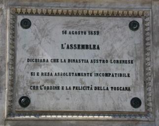 | Keywords: Livorno Piazza della Repubblica plaque 01.JPG en ITA Livorno Piazza della Repubblica The plaque is placed at the basement of the monument of Leopold II Grand Duke of Tuscany to remind that on August 16 1859 the Assembly declares that the Austro Lorraine dynasty has become incompatible with the order and the happiness of Tuscany own Piergiuliano Chesi 2013-04-19 Plaques in Livorno Piazza della Repubblica Livorno Plaques referencing 1859 | ||||