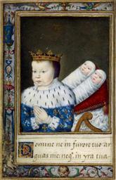 | Keywords: Livre d'heures de Catherine de Medicis 04.jpg Le prince Louis et ses deux soeurs Jeanne et Victoire dans le livre d'heures de Catherine de Médicis BnF Louis de France est le deuxième fils de Henri II et de Catherine de Médicis Né en février 1549 il meurt prématurément en octobre 1550 S'il existait des portraits originaux du jeune prince aucun semble nous être parvenu voir Les Clouet de Catherine de Médicis par Zvereva La seule image qui reste de lui serait une miniature du livre d'heures de Catherine de Médicis La base de données de la BnF nous indique que le petit garçon aux mains jointes représente le futur Charles IX mais on peut supposer qu'il s'agit plutôt du prince Louis Catherine de Médicis a voulu avoir dans son livre d'heures le portrait de tous ses enfants or Charles IX est déjà représenté sur un autre folio De plus le jeune prince est ici représenté avec deux autres enfants de la reine morts en bas âge L'artiste qui a peint le livre d'heures vers 1573 aurait donc regroupé sur une seule page les enfants de la reine morts prématurément http //derniersvalois canalblog com/archives/p180-7 html 16 c author cm institution BNF object history exhibition history credit line accession number PD-old-100-1923 Livre d'heures de Catherine de Medicis Twins in art Files uploaded by Shakko from various sources Ermine clothing in art Children with fur in art |