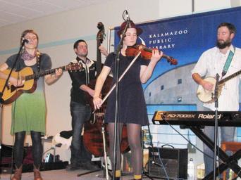 Keywords: kalamazoo library indie music folk live concert liveconcert Lloyd & the Fellas at Kalamazoo Public Library, Wednesday, December 16, 2009. Lloyd & the Fellas met at folk festivals, in sister circles and among gardens in Michigan, assembling live in February 09. The Fellas are a fun time: great for little ones, young hip things, middlers and elders alike. These folks are the ringleaders of a journey through varied sounds: jumpy banjo-y joyful songs; tunes for healing; aching songs that swell with unhurried intensity. The Fellas are Elisabeth Pixley Fink (Lloyd!): lead vocals, piano, charango, guitar, Samantha Cooper (Slam!): vocals, violin, mandolin, feet, Ira Cohen (Iree!): vocals, banjo, guitar, hand puppets, Matt Hollander: drummer boy, hand clapper, Joel Pixley-Fink: bass bumper. www.kpl.gov Lloyd & the Fellas at Kalamazoo Public Library, Wednesday, December 16, 2009. Lloyd & the Fellas met at folk festivals, in sister circles and among gardens in Michigan, assembling live in February 09. The Fellas are a fun time: great for little ones, young hip things, middlers and elders alike. These folks are the ringleaders of a journey through varied sounds: jumpy banjo-y joyful songs; tunes for healing; aching songs that swell with unhurried intensity. The Fellas are Elisabeth Pixley Fink (Lloyd!): lead vocals, piano, charango, guitar, Samantha Cooper (Slam!): vocals, violin, mandolin, feet, Ira Cohen (Iree!): vocals, banjo, guitar, hand puppets, Matt Hollander: drummer boy, hand clapper, Joel Pixley-Fink: bass bumper. www.kpl.gov