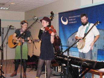 Keywords: kalamazoo library indie music folk live concert liveconcert Lloyd & the Fellas at Kalamazoo Public Library, Wednesday, December 16, 2009. Lloyd & the Fellas met at folk festivals, in sister circles and among gardens in Michigan, assembling live in February 09. The Fellas are a fun time: great for little ones, young hip things, middlers and elders alike. These folks are the ringleaders of a journey through varied sounds: jumpy banjo-y joyful songs; tunes for healing; aching songs that swell with unhurried intensity. The Fellas are Elisabeth Pixley Fink (Lloyd!): lead vocals, piano, charango, guitar, Samantha Cooper (Slam!): vocals, violin, mandolin, feet, Ira Cohen (Iree!): vocals, banjo, guitar, hand puppets, Matt Hollander: drummer boy, hand clapper, Joel Pixley-Fink: bass bumper. www.kpl.gov Lloyd & the Fellas at Kalamazoo Public Library, Wednesday, December 16, 2009. Lloyd & the Fellas met at folk festivals, in sister circles and among gardens in Michigan, assembling live in February 09. The Fellas are a fun time: great for little ones, young hip things, middlers and elders alike. These folks are the ringleaders of a journey through varied sounds: jumpy banjo-y joyful songs; tunes for healing; aching songs that swell with unhurried intensity. The Fellas are Elisabeth Pixley Fink (Lloyd!): lead vocals, piano, charango, guitar, Samantha Cooper (Slam!): vocals, violin, mandolin, feet, Ira Cohen (Iree!): vocals, banjo, guitar, hand puppets, Matt Hollander: drummer boy, hand clapper, Joel Pixley-Fink: bass bumper. www.kpl.gov
